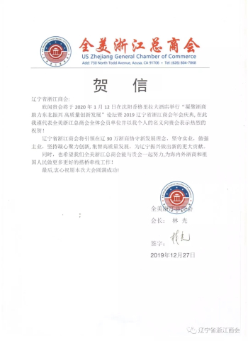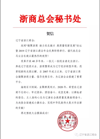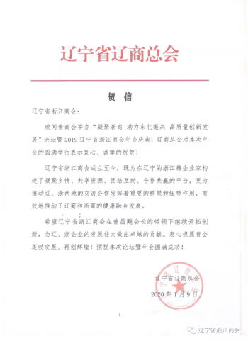 全美浙江总商会、浙商总会、辽宁省辽商总会等国内外商会纷纷发来贺信祝贺。